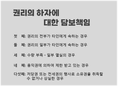 1. 전부 타인권리 : 해제권 2. 일부 타인권리 : 대금감액청구권 3. 저당권, 전세권 실행(행사) : 손해배상청구권, 해제권 4. 수량부족, 일부멸실 5. 제한물권이 설정되어 있는 경우 |