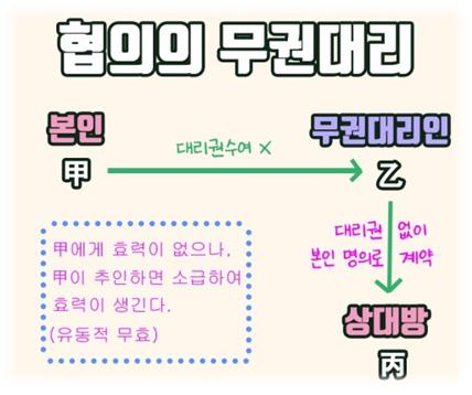 | 본인의 추인권 | 1. 추인은 다른 의사표시가 없는 때에는 계약시에 소급하여 그 효력이 생긴다. 2. 추인은 무권대리행위 전부에 대하여 하여야 하고, 일부에 대한 추인이나 변경을 가한 추인은 상대방의 동의가 없는 한 효력이 없다. 3. 추인은 무권대리인, 무권대리행위의 직접 상대방 및 그 승계인에 대하여 할 수 있다. 4. 추인 또는 거절의 의사표시는 상대방에 대하여 하지 아니하면 그 상대방에 대항하지 못한다. 그러나 상대방이 그 사실을 안 때에는 대항할 수 있다.(제132조) |